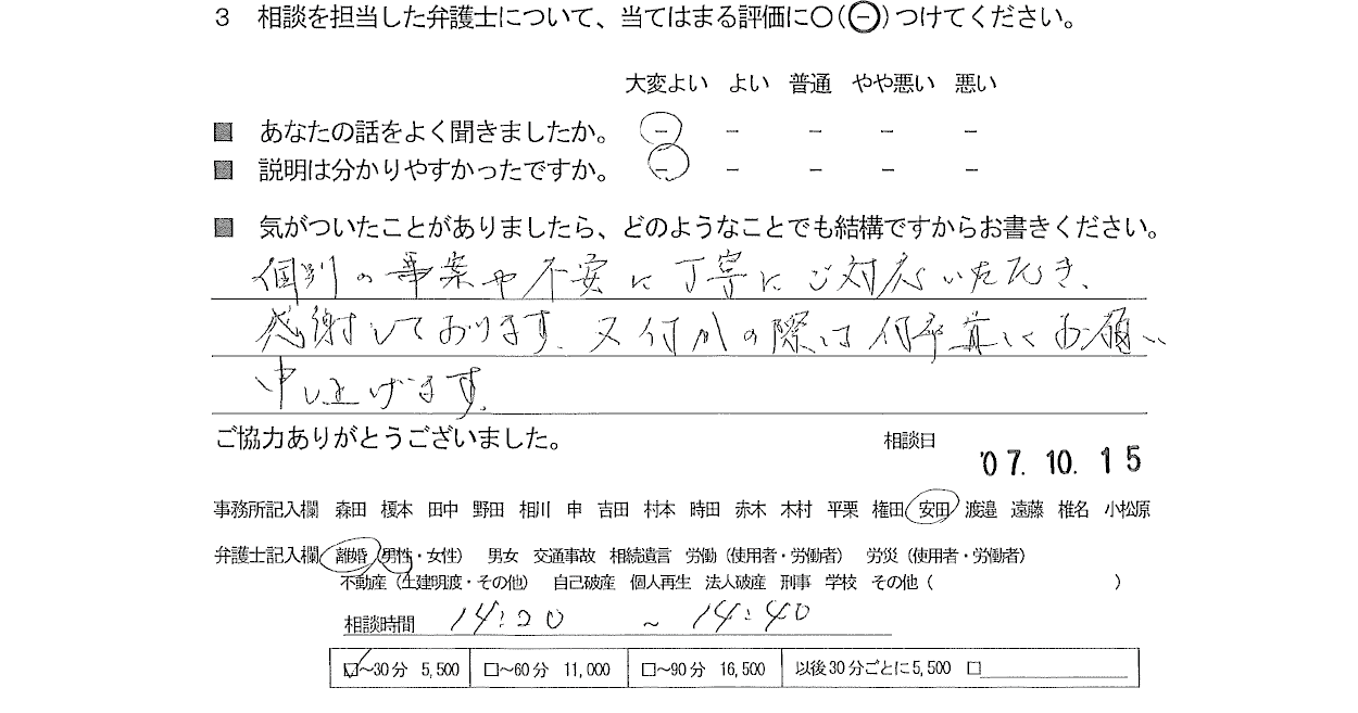 個別の事案や不安に丁寧にご対応いただき、感謝しております。 又何かの際は何卒宜しくお願い申し上げます。