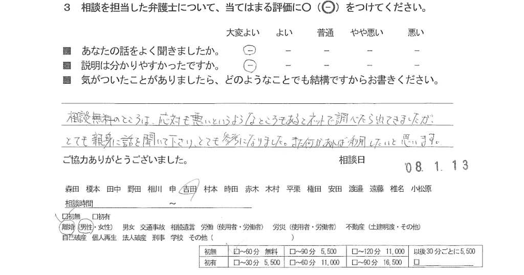 無料相談のところは、応対も悪いというようなところもあるとネットで調べたら出てきましたが、とても親身に話を聞いて下さり、とても参考になりました。また何かあれば利用したいと思います。